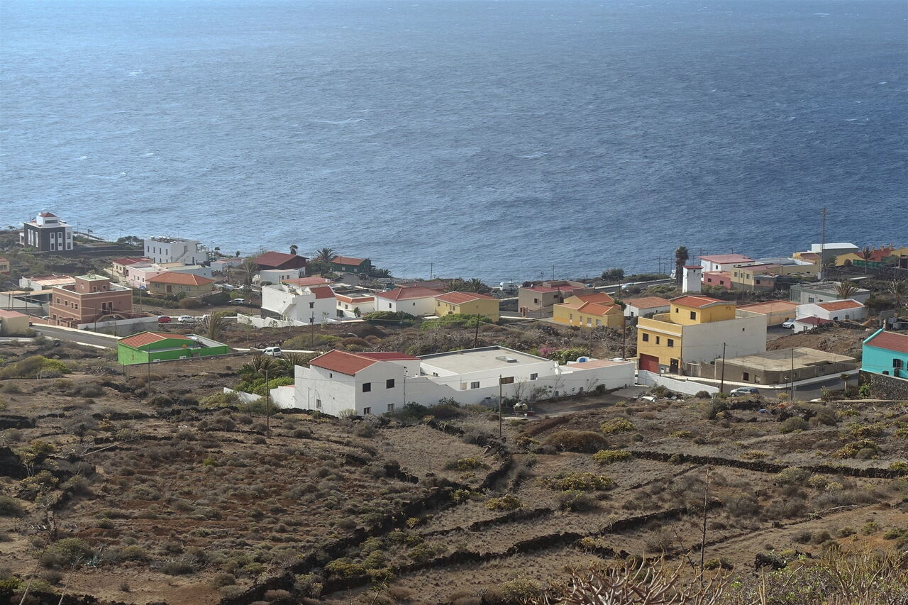 Mit Blick auf das imposante Postgebäude in (01) Valverde (589 m) gehen wir nach rechts und am Gebäude entlang, um bei dem grünen Treppengeländer die Stufen bis zur Straße herunterzugehen. Wir kommen an der kleinen Käsekuchenbäckerei vorbei, queren die nachfolgende Kreuzung und gehen nach 30 m bei der Weggabelung halb rechts – auch ausgeschildert Richtung La Caleta. Auf der Straße zum Flughafen und zum Hafen angekommen, gehen wir 100 m rechts, um dort bei dem Zedernwacholderbaum links auf eine Piste zu gelangen. Diese verlassen wir sofort wieder nach links, bevor die Piste wieder zur Straße hochführt. Vorbei geht es an einem Wassertank und entlang einer oberirdisch verlegten Wasserleitung. Wir überqueren eine weitere, etwas dickere Wasserleitung und gehen hier geradeaus weiter.