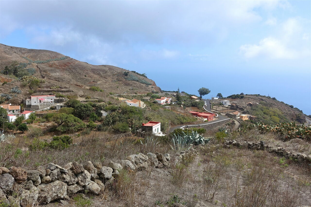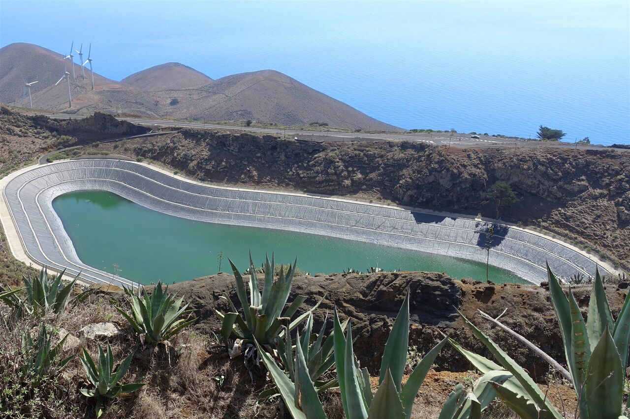 Ab hier gehen wir auf dem Fernwanderweg, der die Insel auf ihrer gesamten Länge durchquert. Fortan ist der Pfad gut markiert und breit ausgebaut, sodass es beinahe unmöglich ist, sich zu verlaufen. Wir queren zweimal die Straße und erreichen die (05) La Caldereta de Tinor (803 m), den Kessel des ältesten Vulkans der Insel. Heutzutage beherbergt die relativ erdbebensichere Caldera das obere Wasserreservoir der Wind-Wasserkraftanlage. Ein letztes Mal queren wir die Hauptstraße und gehen links hinter der Leitplanke auf dem gepflasterten Weg nun direkt nach Valverde herunter.