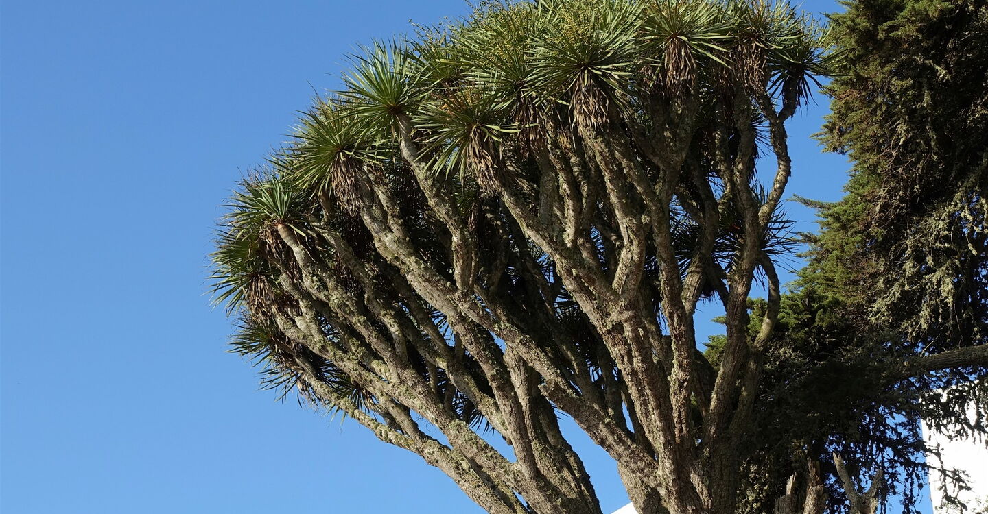 In (01) Valverde (619 m) gehen wir auf der weiterführenden Straße Richtung Frontera, vorbei an der wunderschönen Nordmanntanne und dem danebenstehenden ältesten Drachenbaum von Valverde. Bei dem Verkehrsspiegel und dem grünen Haus gehen wir auf der nach links abzweigenden Einbahnstraße bergauf. Das Bildnis der Madonnenfigur der Virgen de Los Reyes lassen wir links liegen, gehen geradeaus über die querende Straße und vorbei an der riesigen Norfolktanne. Nach einer scharfen Rechtskurve der Straße endet diese. Hier biegen wir scharf links ab und nach 110 m – bei den vier Pinien und noch vor dem Wasserreservoir – wandern wir rechts weiter.