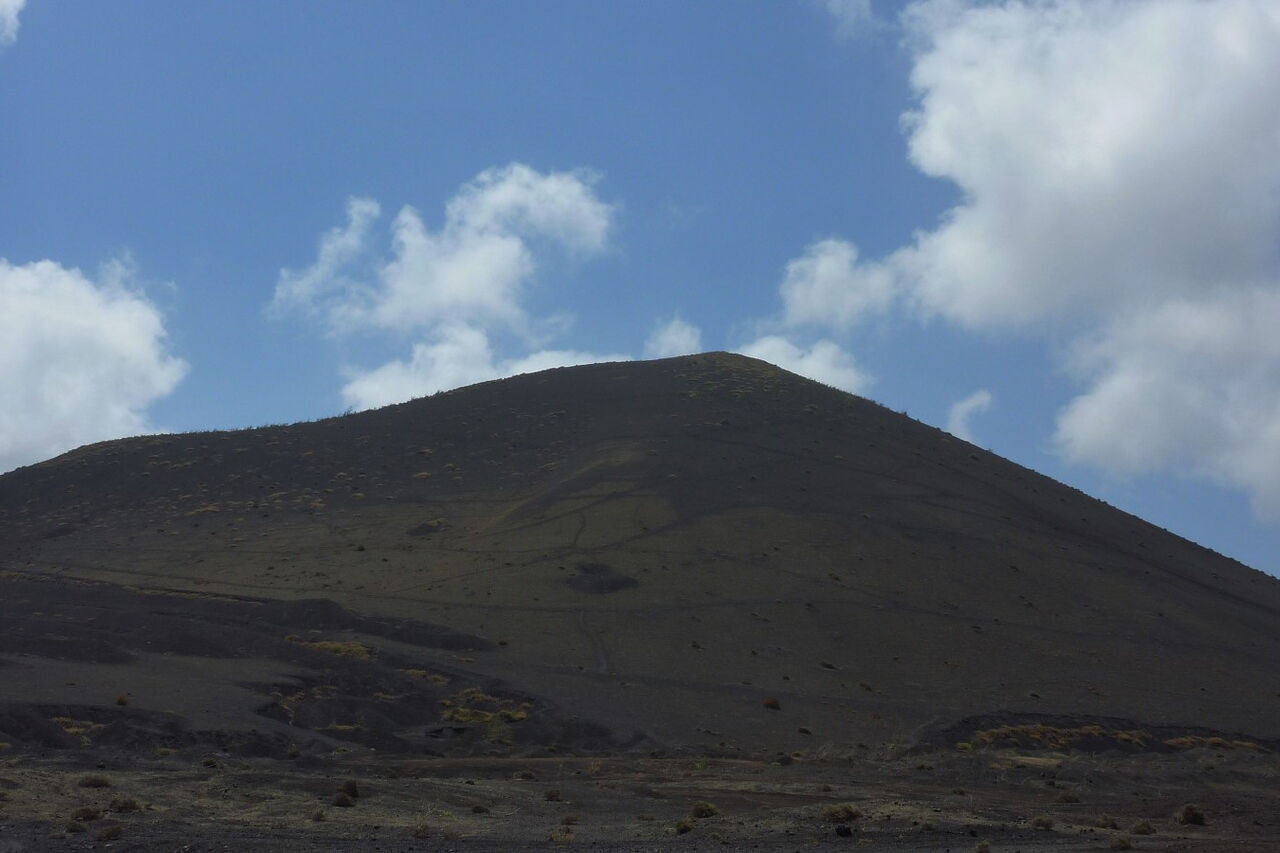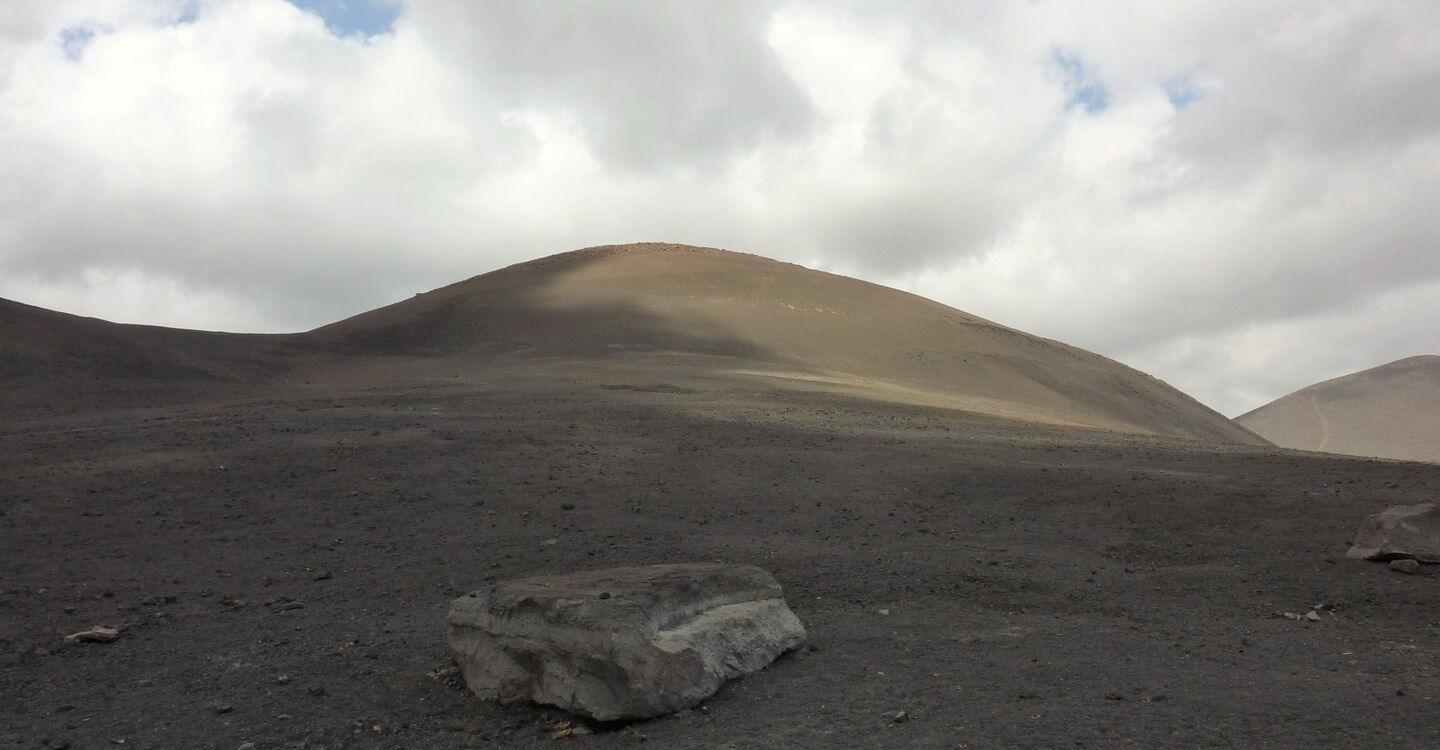 Zunächst gehen wir ein Stück parallel zur (02) LZ-56 (336 m). Wir befinden uns mittig zwischen der Montaña Negra (518 m) - der Vulkan links von uns - und der Caldera de Los Cuervos. Bei näherer Betrachtung könnte man denken, dass die Montaña Negra ebenfalls von 1730-1736 aktiv gewesen ist. Weit gefehlt - da der Vulkan in unmittelbarer Nähe der Vulkanausbrüche stand, wurde er nur von 3-5 m Vulkanasche begraben. Der Vulkan selber stammt aus der früheren Entstehungsgeschichte von Lanzarote.
