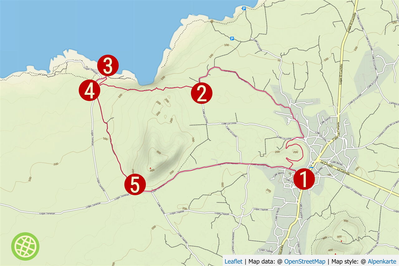 Vom (01) Parkplatz (205 m) gehen wir bis zur Norfolktanne an der Hauptstraße vor, um dann in die gegenüberliegende Calle La Laguneta zu biegen. Vorbei geht es an gigantisch hochgewachsenen Kakteen, bis nach weiteren 100 m, hinter einer Rechtskurve, rechts ein Pfad abzweigt. Er ist zunächst gesäumt von Steinen. Vor einer kleinen Höhle geht es dann links hoch zum Vulkanrand. Im Uhrzeigersinn führt uns der Weg bis zum Gipfelkreuz. Wir gehen nun 300° auf dem Vulkankrater, bis in einer fast kompletten Kehrtwendung ein Pfad rechts herunter zu einer Schotterstraße führt. Dort angekommen gehen wir rechts in östliche Richtung. Wir erreichen bereits nach 20 m eine Weggabelung und gehen dort links, um dann an ihrem Ende bei der Asphaltstraße abermals links zu gehen. Nach 600 m Wanderung in nördliche Richtung biegen wir die 3. Straße links ein, den Camino las Herrentas.