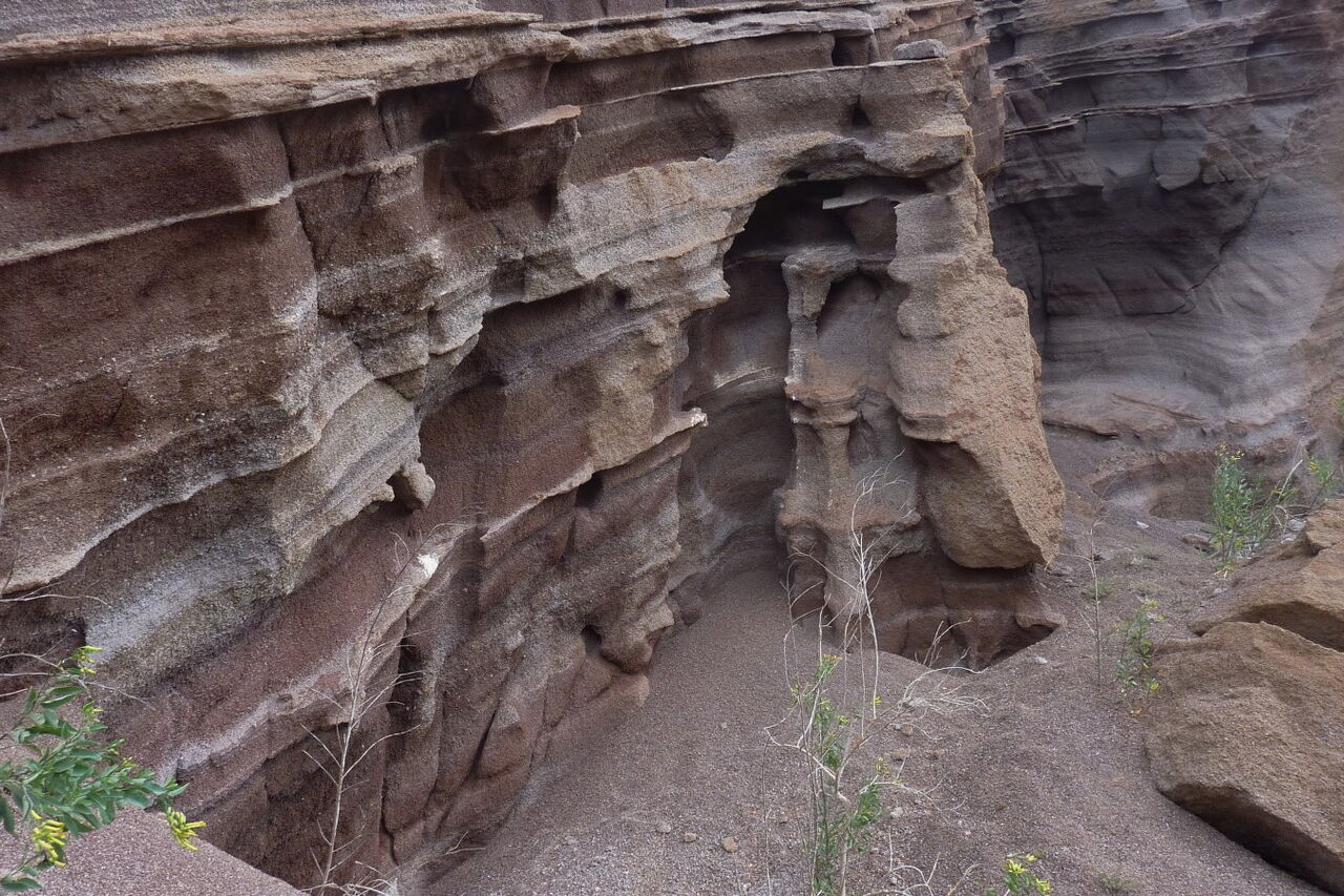 Nach einer Anhöhe können wir in der Ferne das Piratendorf (03) Tenesar (8 m) sehen. Oberhalb der steilen Klippe führt der Pfad bis in ein Barranco, dem wir rechts für 170 m in Richtung Küste folgen. Anschließend gehen wir direkt auf die weißen Häuser von Tenesar zu. Bei einer gepflegten Brotzeit kann man beobachten, wie Riesenwellen mit ihrer enormen Gewalt an der Küste brechen. Am östlichen Rand des Dorfes liegt noch versteckt die nicht ganz saubere Playa Tenesar, die man je nach Stand der Gezeiten über einen Pfad unterhalb der Klippe erreichen kann.