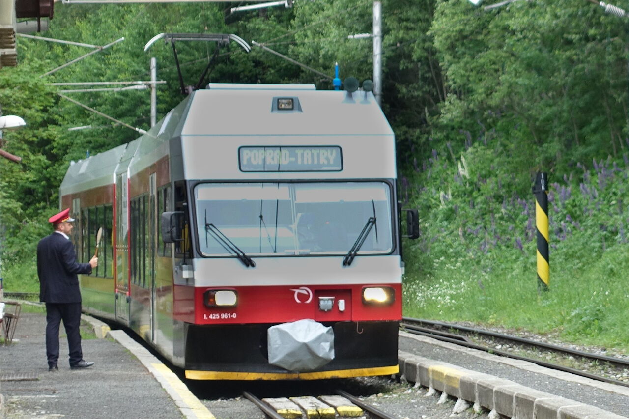 Direkt hinter einer Brücke und dem darauffolgenden überdachten Picknickplatz verlassen wir die asphaltierte Straße nach halb rechts und wechseln auf einen Pfad. Im weiteren Verlauf queren wir mehrmals die Straße. Bei einem Parkplatz gehen wir dann bis zur Hauptstraße herunter, queren diese und erreichen nach wenigen Metern bergab den Bahnhof 05 TEŽ Tatranská Polianka (941 m).