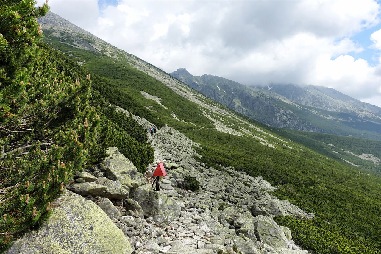Wir queren den natürlichen Abfluss des Sees und folgen der Ausschilderung Richtung Sliezsky dom. Auf dem folgenden Teilstück schaut man über das Zipser Becken bis in die Hohe Tatra. Bei der Weggabelung 03 Rázcestie pod Suchým vrchom (1743 m) gehen wir halb rechts und leicht bergab auf dem gelb markierten Wanderweg.