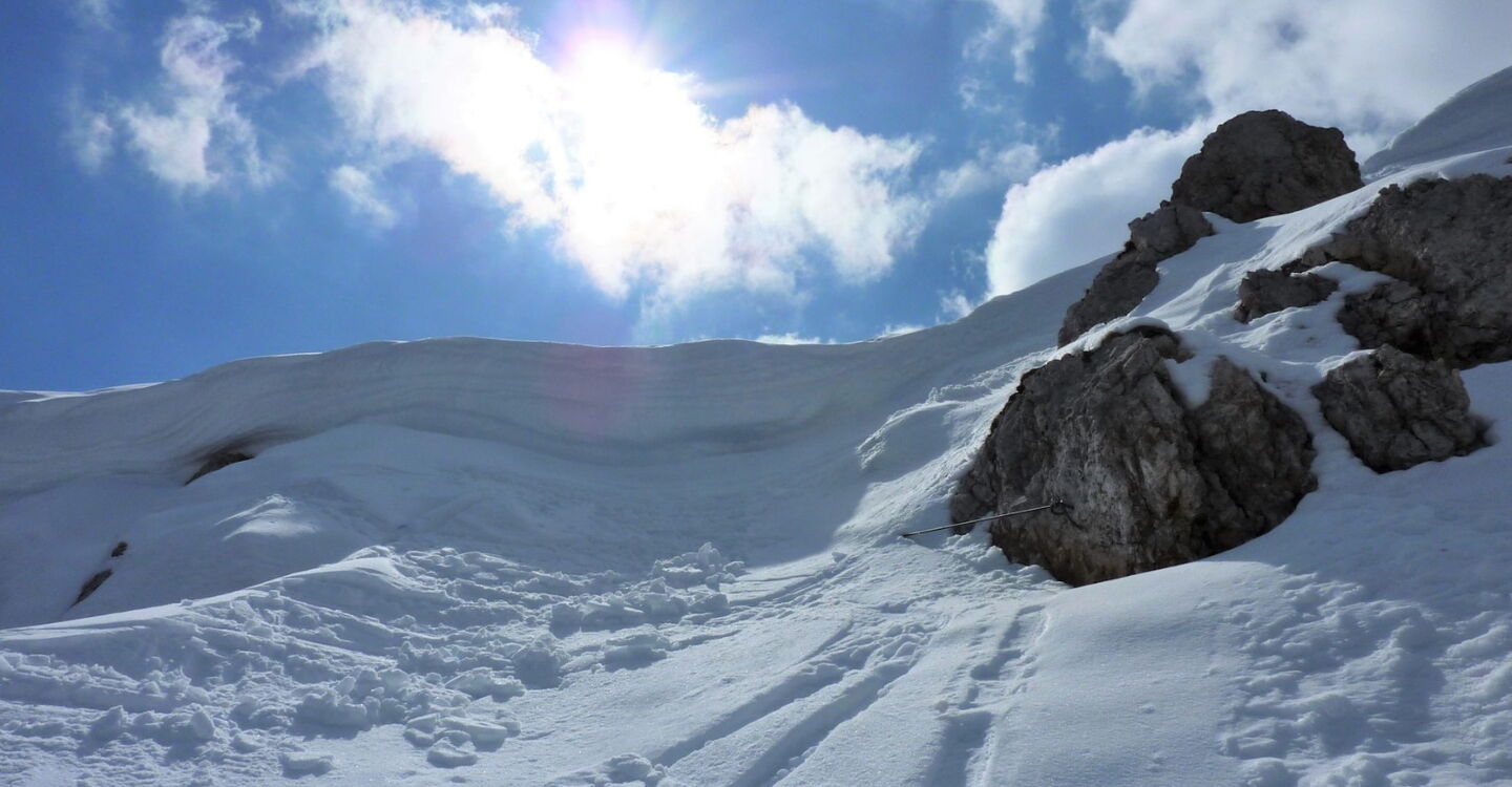 An der Bergstation des Lifts Nr. 8 Fermeda fahren wir 700 m in östlicher Richtung, den Hang querend, wo wir beim Einstieg in die Scharte eine 2 bis 3 m hohe Schneewechte überwinden mussten.