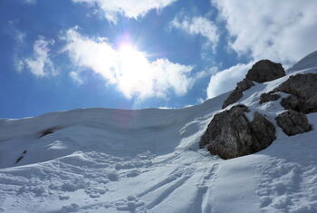 Großartige Variante durch ein verlassenes Tal mit Tiefschneegarantie.
